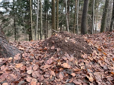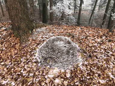 Beim Besuch von verschiedenen Ameisennestern ist mir aufgefallen, dass die Nester in den höheren Regionen viel weniger zusammengefallen sind und weniger mitgenommen aussehen als diejenigen in den unteren Regionen. Auf den beiden Bildern unten seht ihr ein Nest auf dem Üetliberg (ZH), welches ich regelmässig beobachte. Im einem sehr schneereichen Winter, der auch den Üetliberg über mehrere Wochen hinweg im weissen Kleid erschienen liess, hat das Nest seine schöne kugelförmige Form sehr lange beibehalten. In "normalen" Wintern fällt das Nest jedoch immer in sich zusammen, weisst Löcher auf und sieht ziemlich mitgenommen aus.